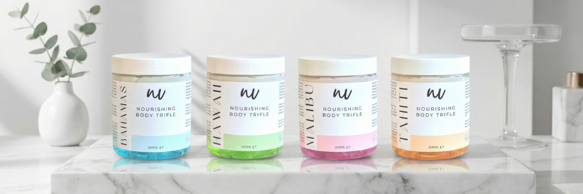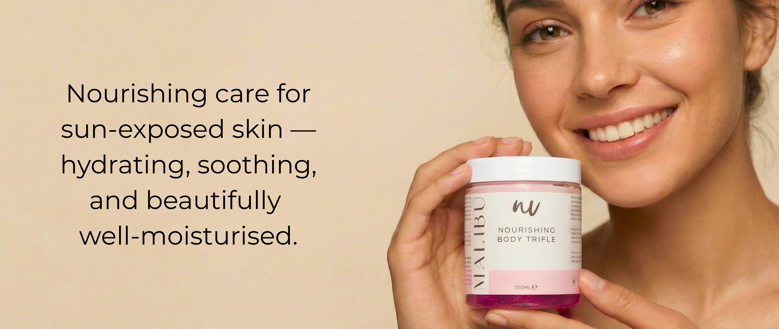 Experience a revitalising blend of cooling Aloe Vera Gel and velvety body butter, crafted to lavish the skin with intense hydration. Our Body Trifle is the perfect companion after long days in the sun, replenishing moisture and enhancing your skin’s natural radiance.